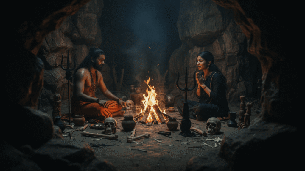 गुफा के अंदर का नज़ारा देखकर मेरी रूह कांप गई। एक भयानक शक्ल वाला तांत्रिक बैठा था, जिसके चारों तरफ इंसानी खोपड़ियां और अजीबोगरीब चीज़ें रखी थीं। और उसके सामने… मेरी ननद माया बैठी थी।
